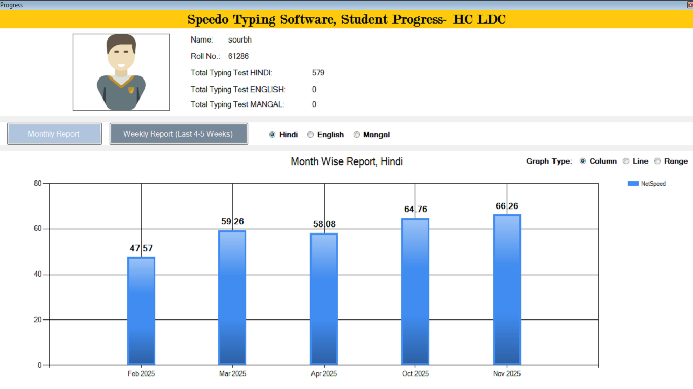 और मासिक टाइपिंग प्रगति(Progress) की रिपोर्ट मिलती है, जो ग्राफ के माध्यम से प्रदर्शित